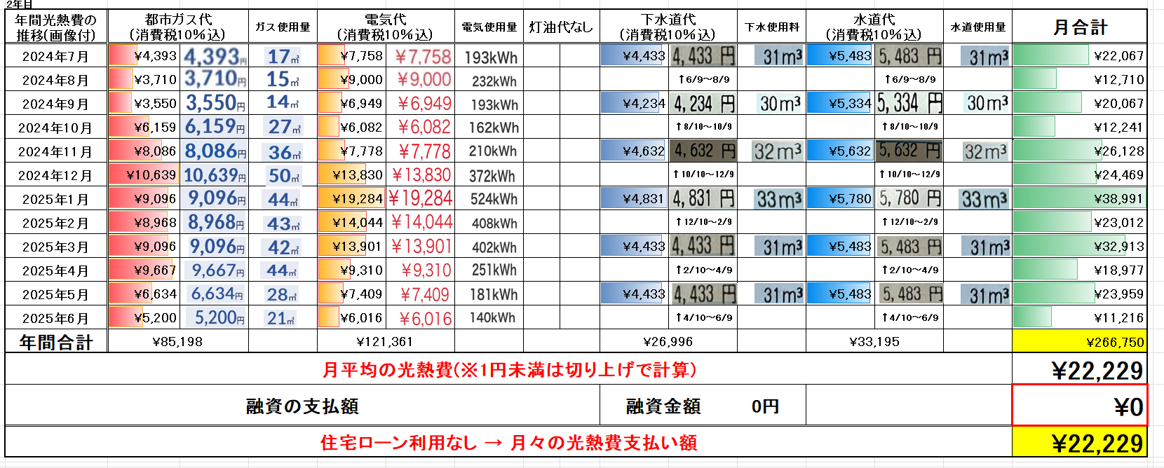 | 備考 | 土地あり、ガス代は都市ガスと契約、電気代は6kVA契約、敷地内給排水工事、冷暖房エアコン(寒冷地仕様)1台→2台へ(2台目は補助金利用)、仮住まい費用、解体費用、都市ガス引込費用、水道権利金(13㎜→20㎜に変更)、火災保険料5年水害保証付き、地震保険料5年一括払い、各種申請料金等 |